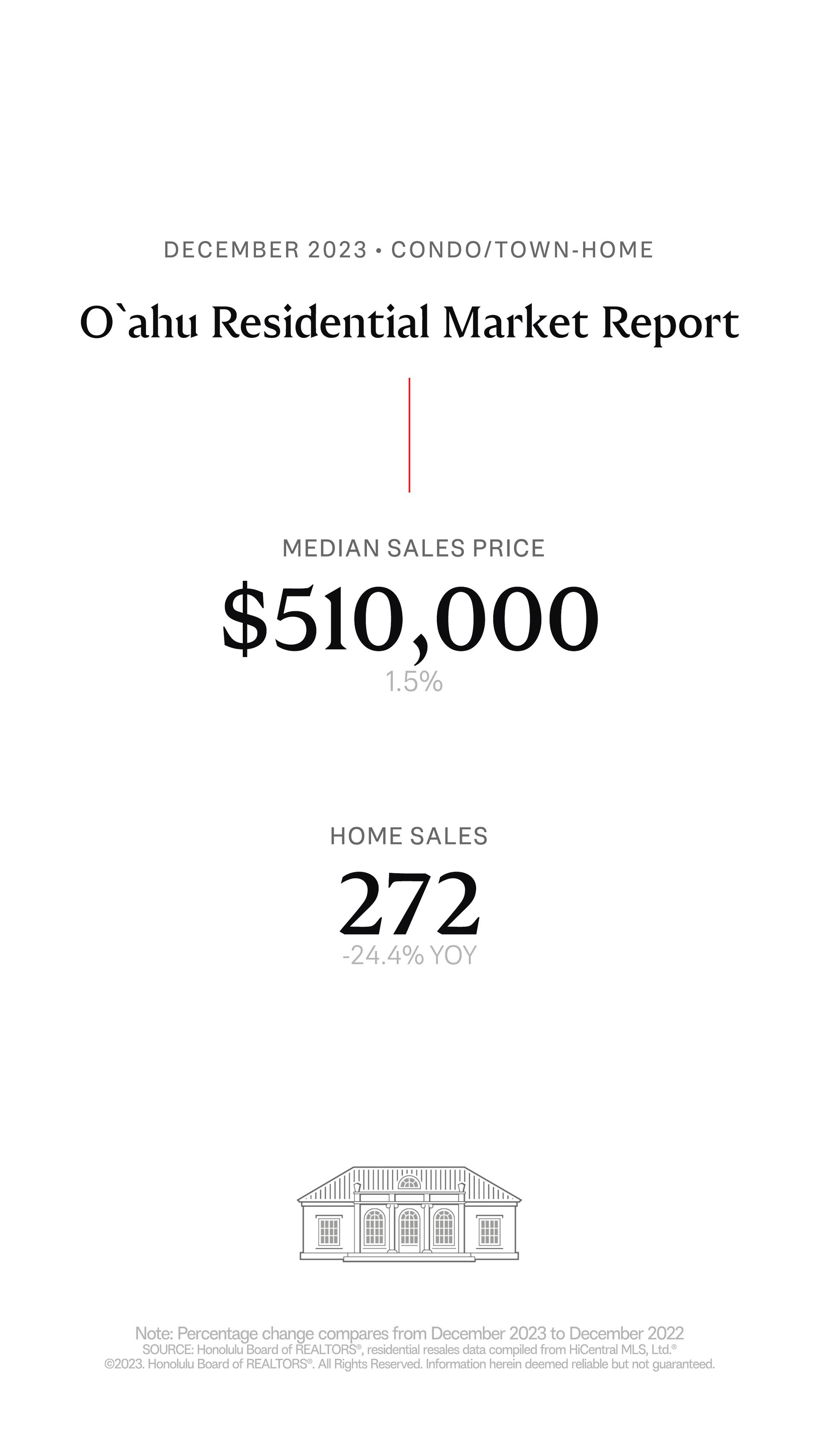 December 2023 experienced slight declines in year-over-year sales volume and median sales price. The busy holiday season mixed with a fluctuating economy slightly affected our island housing market. Despite a tumultuous and uneasy 2023, the Hawaii real estate market plateaued with numbers remaining steady and consistent. Similar to the housing crises of the past, Hawaii continues to persevere, experiencing an equalizing and balanced housing market compared to the overwhelming pressure around the nation. With a low inventory, continued appreciation, and a hopeful economy, we can expect buyer activity to remain consistently active as people continue their pursuit of home ownership and wealth in real estate.